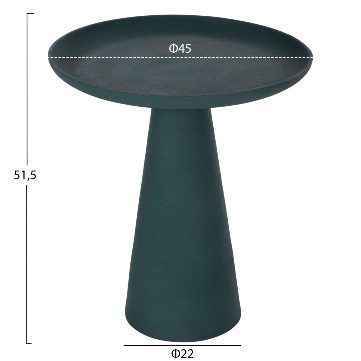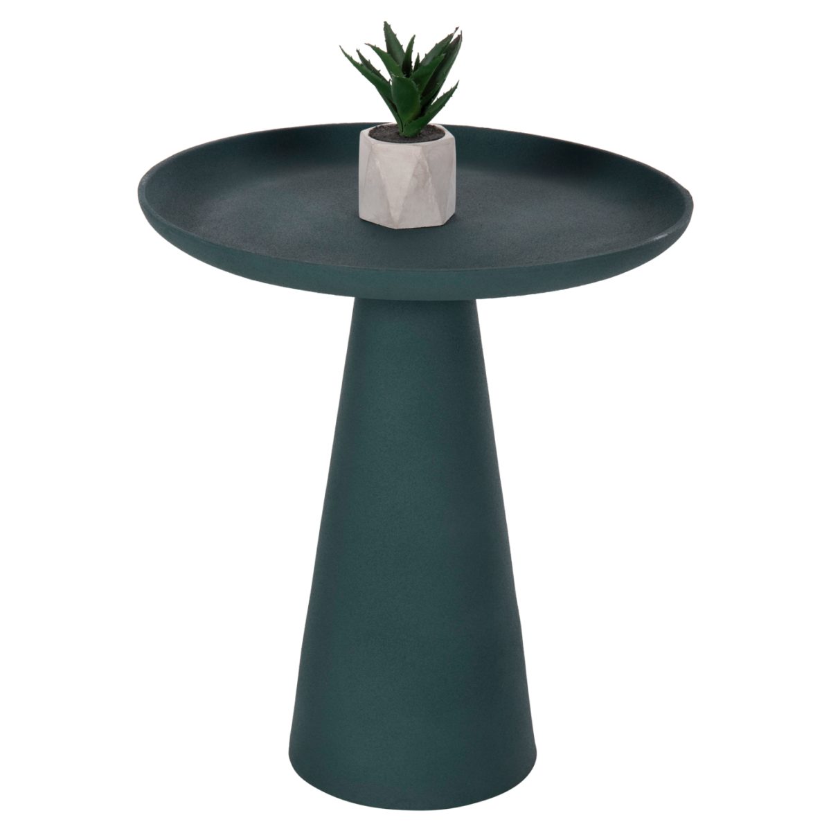 The DELCON side table for the living room is one of the new additions to our range. It is a round metal table with a conical base. Its color is entirely GREEN. The peculiarity of this table is that the texture of the color is rough, as well as that the perimeter of the surface is raised and looks like a plate. Ideal for both home and professional spaces.