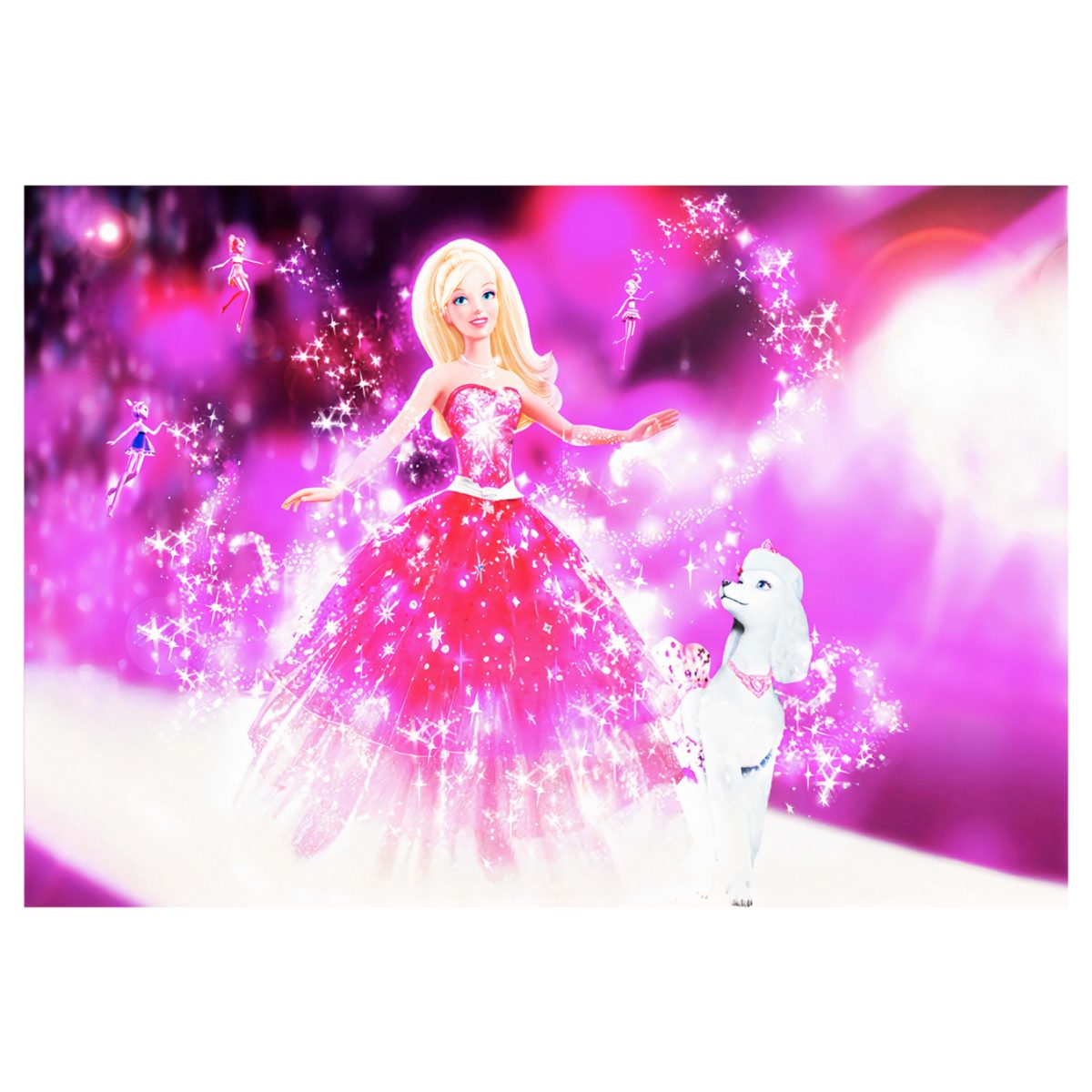 This stunning rug for girls has a dominant PINK color and no border. The entire rug is a beautiful image of the popular blonde doll with her white dog, shining in her pink glittery dress "bathed" in "stardust". After all, what more does a child need to put their imagination to work?