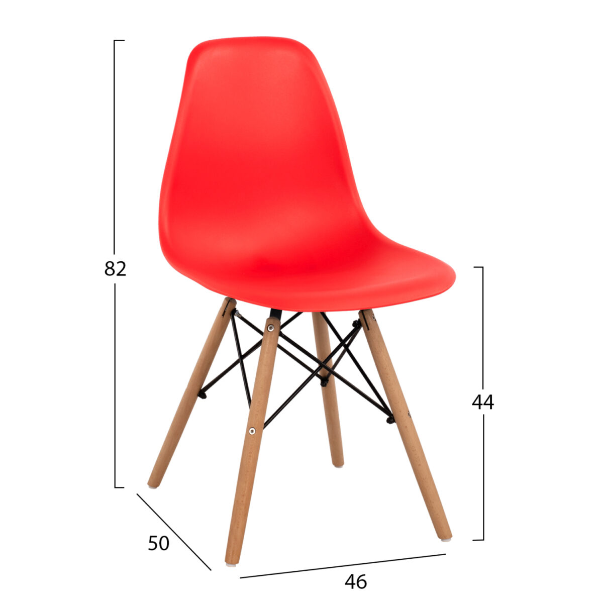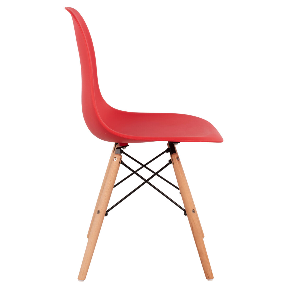 Μία μοντέρνα καρέκλα κατασκευασμένη από ξύλινο σκελετό και κάθισμα πολυπροπυλενίου σε κόκκινη απόχρωση.