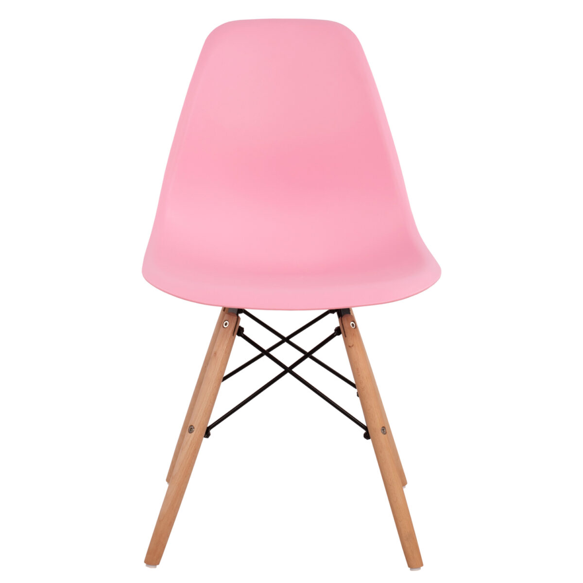 Μία μοντέρνα καρέκλα κατασκευασμένη από ξύλινο σκελετό και κάθισμα πολυπροπυλενίου σε ροζ απόχρωση.